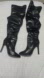 Glossy black thigh-high boots with sleek stiletto heels. Ideal for a chic look.
