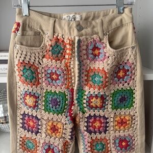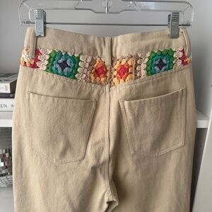 Featuring front panels in charming, multicolor crochet, these Free People pants are an eye-catching alternative to your usual jeans. Fabric: Heavyweight, non-stretch denim. Crochet front with geometric pattern. Button fly. 5-pocket styling. Shell: 100% cotton. Size 26. Great preloved condition, some pulled threads in a couple spots