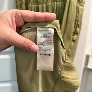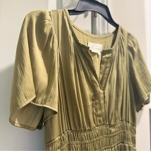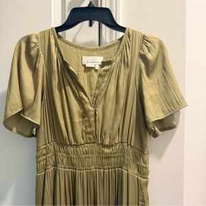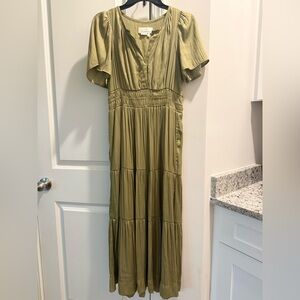 Chic sage green maxi dress. Short sleeves with a gathered waist. Ideal for versatile styling.