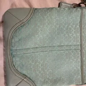 Stylish Coach crossbody bag in sky blue. Features signature pattern. Ideal for daily use.