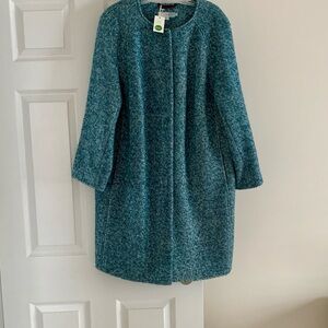 Brand new, never worn, side pockets, lined, snap closure, price firm. Approximately 23” pit to pit.