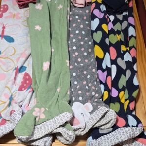 Adorable Carter's pajamas set. Includes green with mouse design, gray with pink polka dots, and multicolor heart patterns. Soft and cozy fabric.