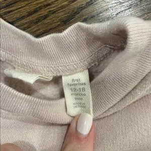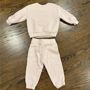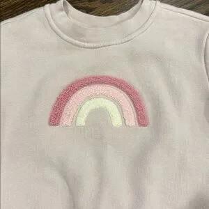 Baby Gap light pink sweatshirt and jogger set with a rainbow design. Ideal for play and casual wear. Elastic waist with faux drawstring. Subtle stains on pant leg (pictured). No other obvious signs of wear. Size 12-18 months.