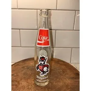 Relive the magic of the "Cardiac Pack" with this commemorative NC State Wolfpack 1983 NCAA Champions Coke bottle. This collectible glass bottle celebrates one of college basketball's most iconic underdog victories, a moment etched into sports history. Displaying the victorious 1983 championship, this bottle is a fine tribute to the team that captured the hearts of fans everywhere. This NC State Wolfpack 1983 NCAA Champions Coca-Cola bottle is a tangible piece of basketball history. It features the distinctive branding associated with the momentous championship win, making it a significant item for any NC State fan or collector of sports memorabilia. The bottle is in very good condition, showcasing well-preserved graphics and structural integrity. Whether you're a lifelong Wolfpack supporter, a collector of NCAA championship memorabilia, or simply appreciate the nostalgia of 1980s sports, this NC State Wolfpack 1983 NCAA Champions Coke bottle is a must-have addition. It's an excellent way to honor the legacy of that unforgettable team and keep the spirit of their championship run alive.