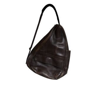 The Vintage LL Bean Ameribag Leather Brown Healthy Back Crossbody Sling Bag Backpack is a large, triangle-shaped bag made of soft leather in a classic brown color. It features a zip closure, brown and gold hardware accents, and a comfortable crossbody strap handle style. This versatile bag is perfect for travel, casual wear, and work, with inner and outer pockets for organization. The vintage design and adjustable strap make it a timeless accessory for unisex adults looking for a sturdy and stylish backpack.