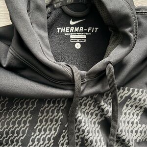 Cropped black hoodie with Therma-Fit technology. Features bold patterns and Nike branding.