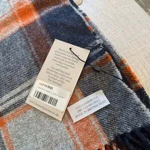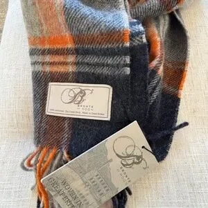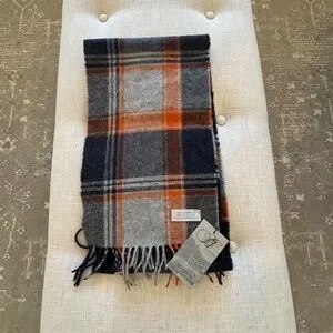NWT Bronte by Moon Scarf Merino Lambswool navy, orange, and grey plaid patt
