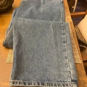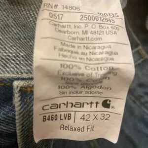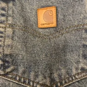 Light blue denim with a tan Carhartt logo patch. Durable and stylish. Good used condition. 42x32