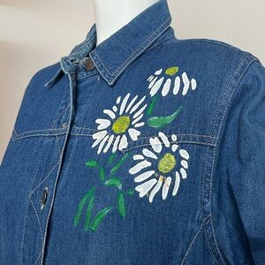 Elegant long sleeve denim dress with floral accents. Ideal for casual wear. Hand painted floral design,