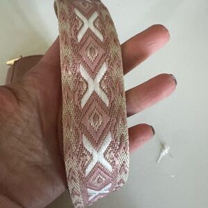Strap: Wide, adjustable, and detachable patterned fabric strap featuring a trendy geometric/Aztec design in coordinating colors (mauve, cream, brown).