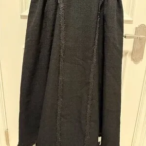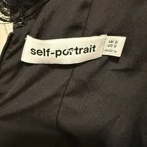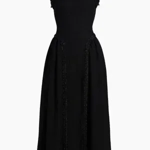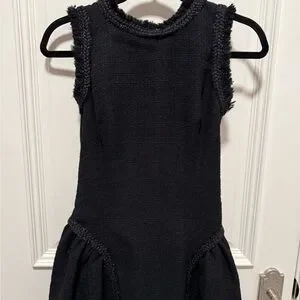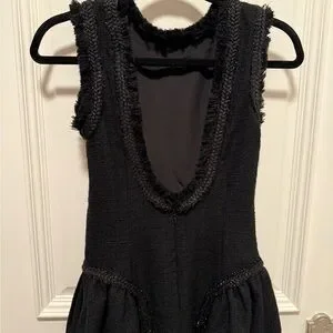Chic Self Portrait black bouclé sleeveless midi dress in size US2/UK6. Features braided fringe trim, round neck, concealed back zip, dropped waist, plunging back, and full lining. NWOT and excellent; note tiny hole in product label only. A timeless, elevated option for wedding guests, cocktail events, and soirées. Fast same or next-day shipping.