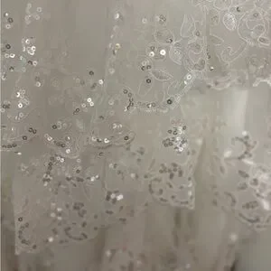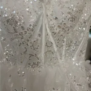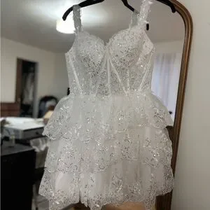Elegant white lace dress with sequins. Features a tiered design and intricate detailing. New, never used.