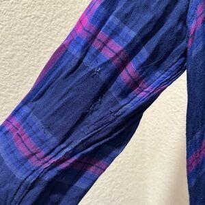 Stylish plaid button-down shirt. Features blue and pink colors. Single chest pocket. Long sleeves with button cuffs. Size medium. 100% rayon. Soft. Few flaws, see photos of loose threads.