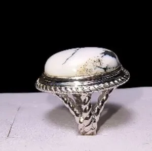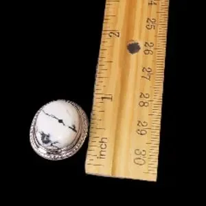 A very pretty, eye-catching ring with a beautiful White Buffalo cabochon as the focal point. Brand new and ready to wear.