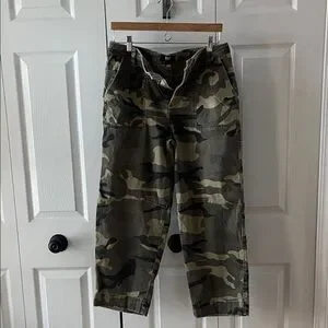 Kut camo barrel leg pants. Sold out online at Kut. Size 8. The hems are lightly frayed which is how they are made. It’s not wear and tear. Bought these and wore a couple times but they’re just too big for me. Non-smoking home.