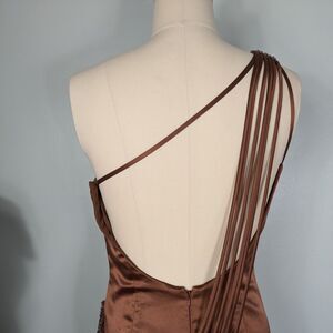 One-shoulder slinky satin prom dress maxi mermaid gown from Envi Prom, size 10. Brown satin with floral beading at shoulder and hip. One shoulder, draped fringe at open back, trumpet flare with side train and wrist loop. Ideal for dramatic, movie star, hollywood, elegant, and classic vibes.