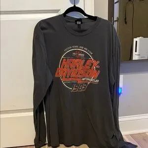 Dark gray long sleeve tee with bold Harley-Davidson logo. Perfect for casual wear. Some dark spots on the bottom side in the back.