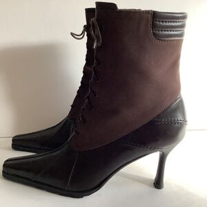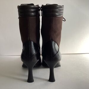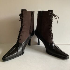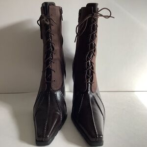 These brown Stuart Weitzman boots blend the elements of witchy and steampunk styles, creating a unique and captivating vibe. Crafted from high-quality leather, they feature intricate lace-up detailing that adds a touch of allure. With a heel height of approximately 4 inches, these boots provide a boost of height while maintaining comfort.
