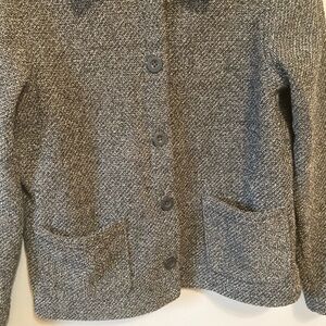 Classic blazer/sweater with button closure. Features two front pockets. Ideal for layering.