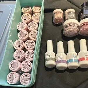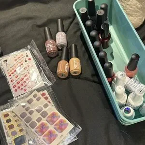 A collection of assorted gel nail polishes and nail art stickers. Includes various shades and designs for creative nail styling. Both dip nail and gel polish, all assorted colors. Some slightly used, most new and never used.