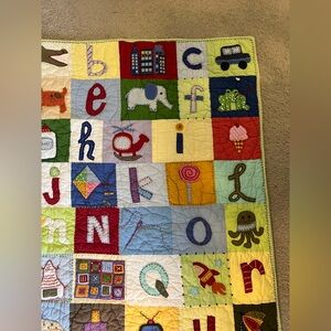 Pottery Barn Kids ABC Alphabet Crib Quilt Blanket for Baby, Infant, or Toddler. Measures: 49x36”. Makes a beautiful baby blanket gift or blanket for in the crib, tummy time, or in the car or stroller! 100% cotton. This is in beautiful mint condition. There are no stains, tears or odors. This was only laundered with fragrance, free laundry detergent. From a pet free and smoke free home.
