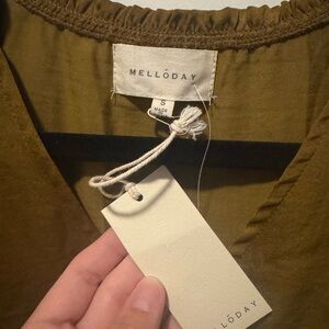 Chic mustard blouse by MELLODAY. Features a V-neck and smocked shoulders. Perfect for versatile styling.