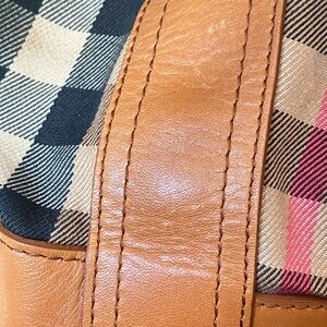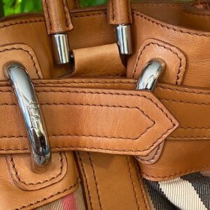 Chic Burberry shoulder bag with iconic plaid pattern. Features tan leather accents and silver hardware. Perfect for stylish outings.