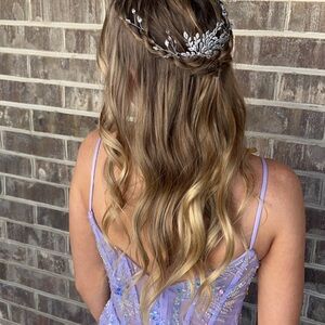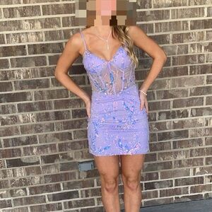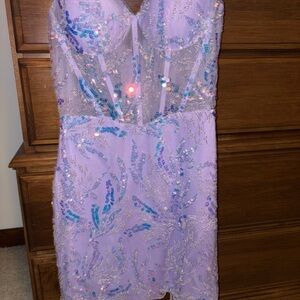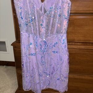 Stunning strapless dress with sequin embellishments. Features a mix of blue and purple sequins on a lavender base.