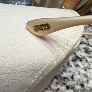 Stylish Tom Ford sunglasses with a sleek gold infinity frame. Perfect for adding elegance to any outfit. Comes with pictured sunglasses holder.