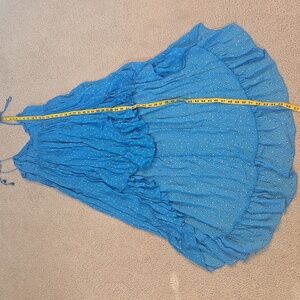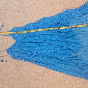 Karina Grimaldi blue floral tie spaghetti strap high low dress. Zips up back. Adjustable tie straps at shoulders. Lined. Viscose and polyester. Dry clean only. Cute for resortwear, vacation, wedding guest, or casual wear.