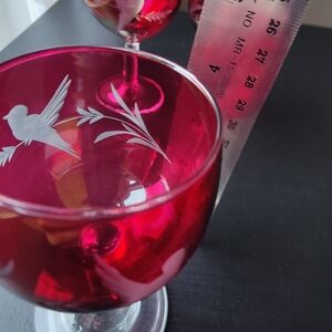 3 | red 🍒♥️ flashed glass | Vintage Wine Glasses with Etched Birds 🐦