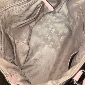 Chic Michael Kors satchel in blush pink. Features signature logo charm and sleek design.