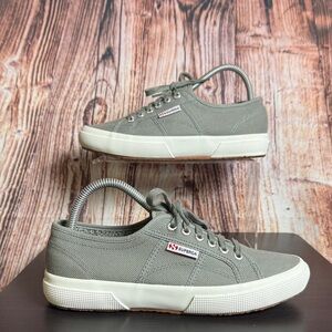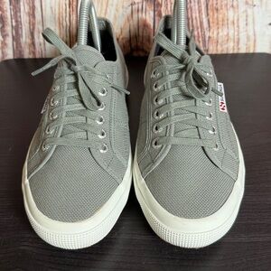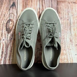 Superga Cotu Classic gray/white low top lace up sneakers in a womens size 9 or a mens size 7.5. Shoes are used but are in like new condition. Please see all pics!