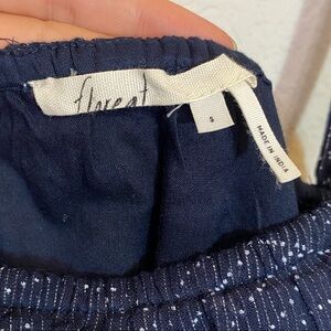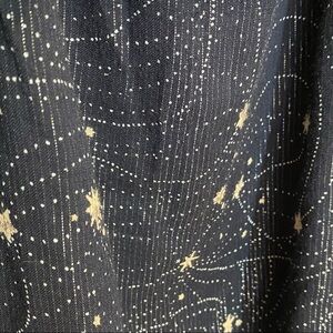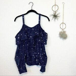 Floreat for Anthropologie cold shoulder top in navy blue with silver Star print threaded throughout. Sleeves are sheer. Can be worn with additional straps or push them down for a complete off shoulder look.