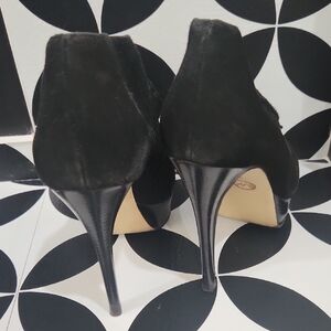 Chic black leather ankle boots with peep-toe design. Features stylish buckle accent. Perfect for versatile wear. Excellent condition, hardly worn.