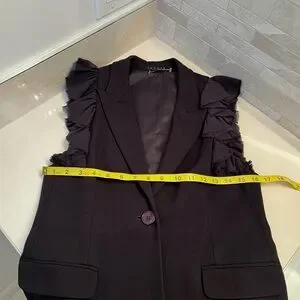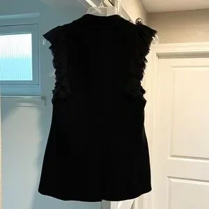 PRICE FIRMđź”’EXCELLENT CONDITION. One-of-a-kind elegant black multi media blazer vest with tulle organza chiffon ruffle sleeves. Single-button closure, mock pockets, back vent still sewn shut. Tagged size 10, runs very small, listed as size 6. For fit accuracy, compare measurements in photos to your body or vest to confirm fit.