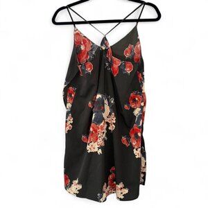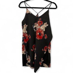 Moody florals accent this slip dress that features a V neck front, draped front overlay and skinny racerback.
