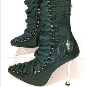 Step into luxury with these fierce Azalea Wang ankle boots featuring a glossy crocodile-embossed finish in deep green, metallic gold stiletto heels, and oversized crisscross lacing threaded through bold gold eyelets. A rear zipper ensures easy wear while the dramatic silhouette channels runway energy and holiday glam.