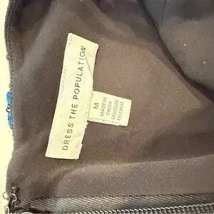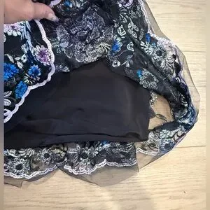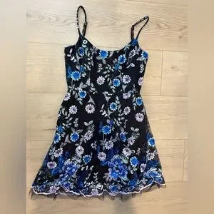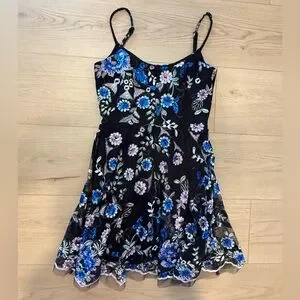 Chic mini dress with floral pattern made of different colored sequins on a black sheer mesh. Features a fitted bodice and flared skirt. Perfect for any occasion depending on how you style it.