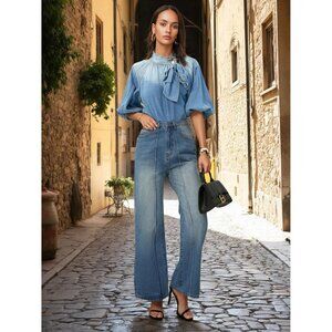 FEATURES: This women's jean top features puff sleeves, mock neck, gradient color, button, bow, loose, stretchable and elastic cuffs. Unique detail decoration makes this high-quality womens denim shirts your fashion accessory.
