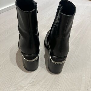 Chic black boots with a unique silver heel. Perfect for elevating any outfit.