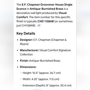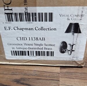 E.F. Chapman Grosvenor House Single Sconce In Antique-Burnished Brass. NIB (new in box). Shade and bulb not included, only the sconce. Posted in the pictures are the specific details of the exact sconce.