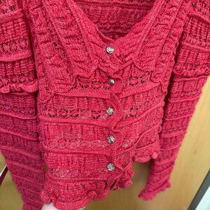 Free People crochet knit cardigan in a bold raspberry pinkish red. Cropped silhouette with flounced cuffs and hem, metallic rose-embossed buttons, and delicate textured design throughout. Lightweight and perfect for layering. Gently worn and in excellent condition.