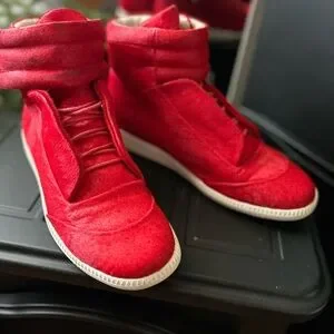 Bold red high-top sneakers. Features a sleek design. Comfortable and stylish.