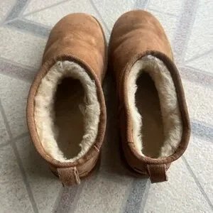 Cozy UGG winter boots. Soft tan suede exterior. Warm cream lining. Perfect for cold weather.
