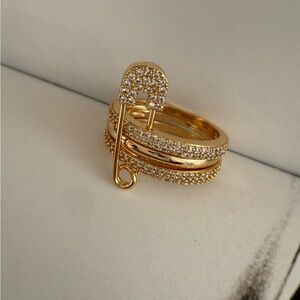 A bold and sophisticated statement piece designed to turn heads. This pavé safety pin ring features a unique triple-band silhouette, crafted from durable copper alloy and embellished with shimmering cubic zirconia crystals for a dazzling finish. The safety-pin motif brings a modern, edgy twist to a timeless, elegant design — perfect for those who love jewelry with both style and attitude.