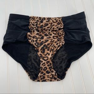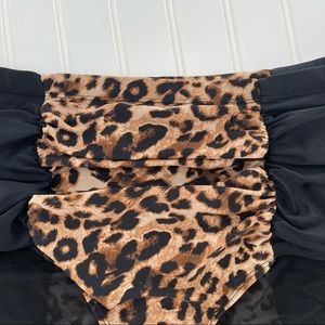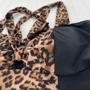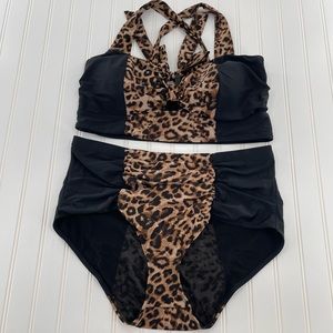 Stylish leopard print bikini. High-waisted bottom. Halter top with bow detail.
