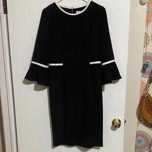 Chic black dress with elegant white trim. Long sleeves with flared cuffs. Perfect for formal events. 17” Ptp
