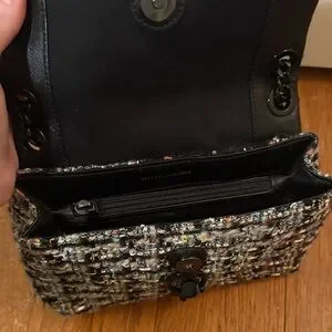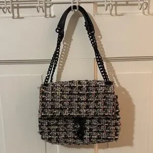 Stylish tweed design with a vibrant multicolor pattern. Features a sleek black chain strap. Perfect for adding flair to any outfit.