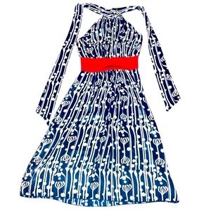 This stunning Forever 21 maxi sundress features a beautiful dark blue background adorned with wavy gold design, creating a dynamic look. The dress is designed sleeveless and a flattering halter neckline, making it perfect for a cocktail occasion. Great condition. No flaws.